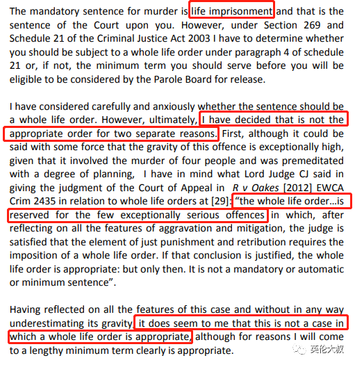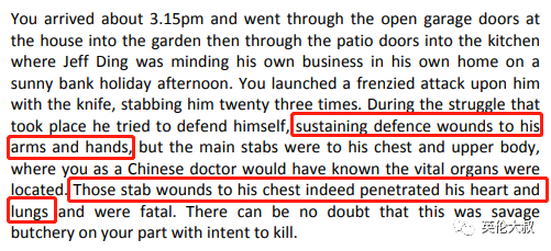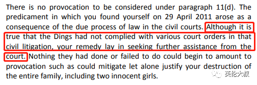 正如法官Flaux在判词中对杜安翔说的那样:在进行谋杀前,你身处的困境是民事法庭正当法律程序的结果。虽然丁氏夫妇在民事诉讼中确实没有遵守法院的各种命令,但你对此的补救/处理办法应该是向法院寻求进一步的协助。丁氏夫妇所做的任何事都不能构成挑衅(你杀戮他们一家人的理由),也不能减轻你对他们,包括两个年幼无辜女孩的整个家庭的破坏。