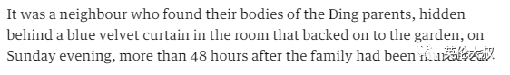 察觉出异样的邻居,在5月1日,也就是周日傍晚六点十五分,前往丁家确认这家人的状况,却意外透过玻璃窗,看到了藏在背对花园的厨房里的蓝色天鹅绒窗帘后面的46岁的丁继峰(音译,Jifeng Ding)和47岁的崔鸽(Helen Cui)的尸体。