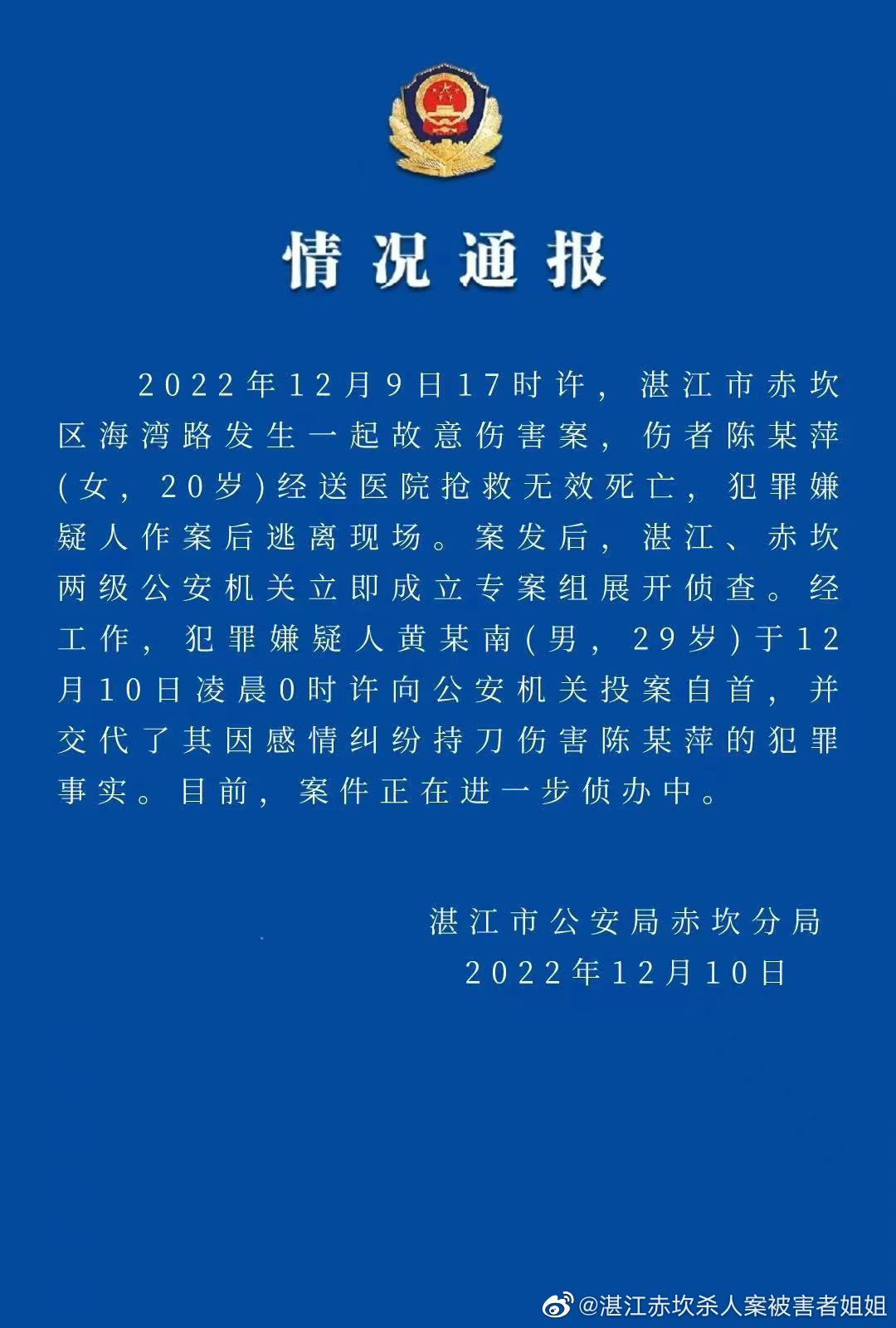 2022年12月9日,广东湛江市赤坎区海湾路发生一起当街砍人事件。20岁的陈某萍在下班回宿舍的路上被前同事黄某南拦截,后被其当街捅刺16刀,经送医院抢救无效死亡。随后,警方通报中提到,黄某南因感情纠纷持刀伤害了陈某萍。