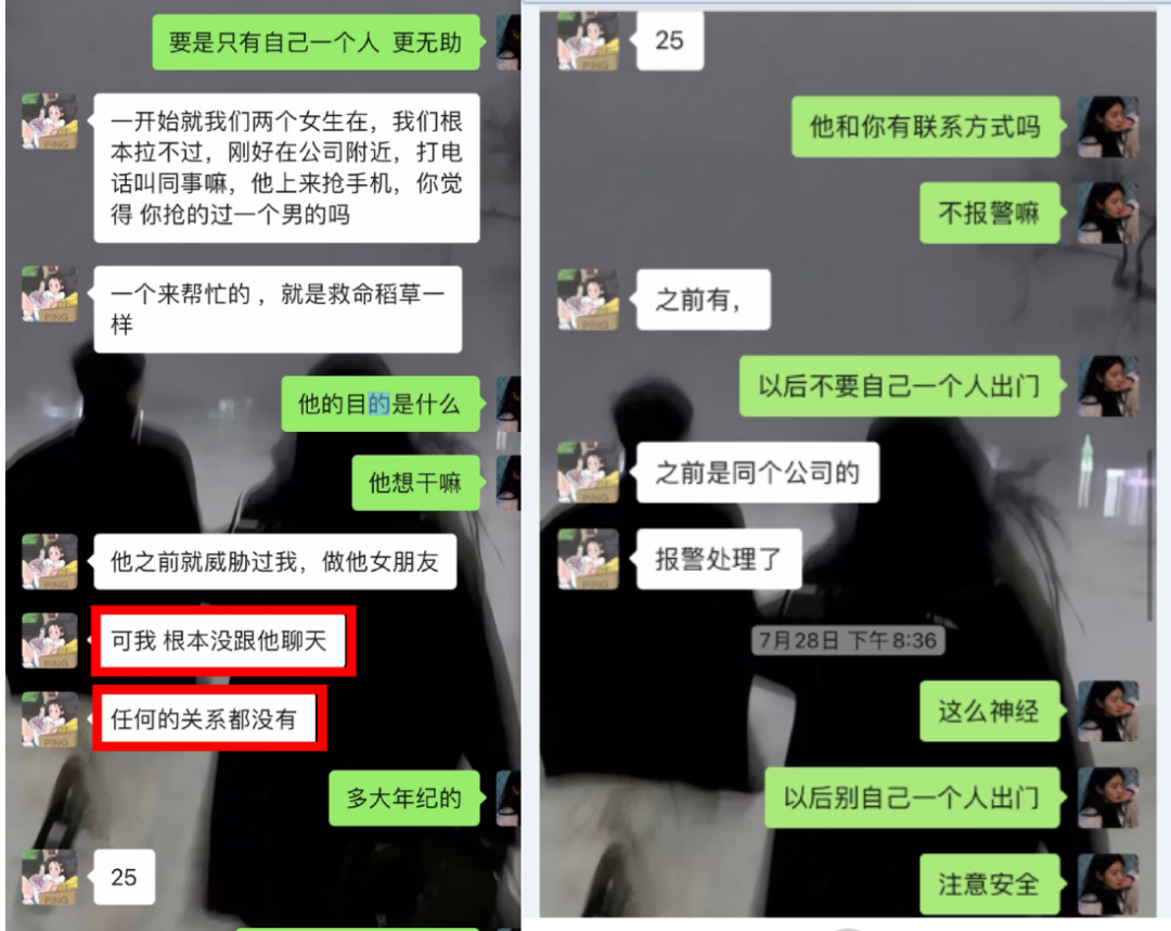 2022年7月28日下午4时,陈某萍和同事骑电动车返回宿舍途中,再次被携带刀具的黄某南拦截。李雅回忆,当时,电动车还没有停稳,黄某南便死死拽住了陈某萍的胳膊,要求她加回被删的微信,并且同意做他女朋友,“他兜里揣着刀,威胁说死也要得到陈某萍”。