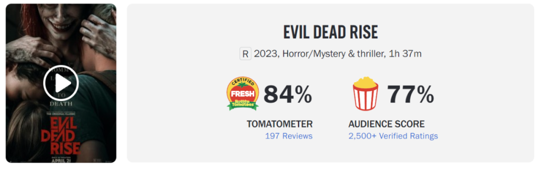 此外,该片的烂番茄新鲜度高达84%,爆米花指数77%,不管是专业影评人,还是普通观众,都对这部恐怖片相当满意。
