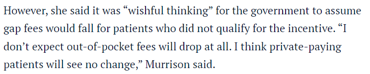 因为我们已经将患者自付费用提高到45澳元或50澳元,政府提供的20澳元与我们收取的费用相差甚远。”