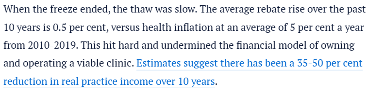 对于一家正常运营的诊所来说,这是一种财务上的沉重打击。也正因如此,在过去10年中,澳洲诊所实际执业收入减少了35%至50%。