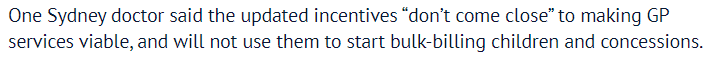因此,对于大多数市区的全科医生来说,当下政府的看病补贴远远不够!在这种情况下,澳洲的私营诊所随时都可能倒闭!