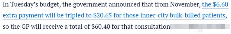 虽然在上周公布的预算中,澳洲政府还宣布,从11月起,市区病人额外支付的6.60澳元将增加到20.65澳元,届时全科医生将获得60.40澳元的咨询费。