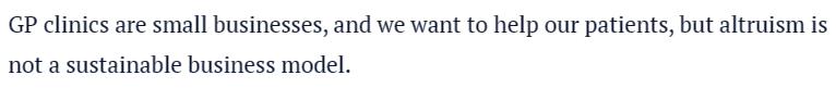 对此,全科医生Sarah就表示,她的诊所每年的固定成本远超过100万澳元。如果自己在日常运营中对病患批量计费,自己就会破产。