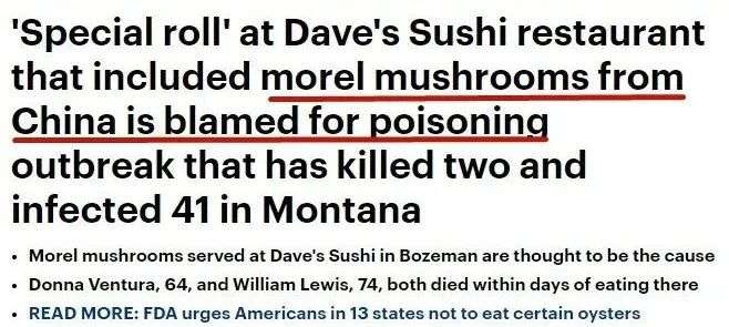 上周,美国媒体集体报道了一起食物中毒事件。多名食客在蒙大拿州(Montana)的一家寿司店用餐后出现了中毒症状。现已造成2人死亡及逾40人感染。而来自中国的食材“羊肚菌”,却成了矛头所指。