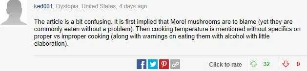 不过也有一些明事理的网友,认为文章存在很大的误导性。“文章写的让人迷惑。首先暗示羊肚菌是罪魁祸首(但它们通常可以毫无问题地食用)。然后提到烹饪温度,但没有具体说明他们的烹饪方法正确或不正确。”