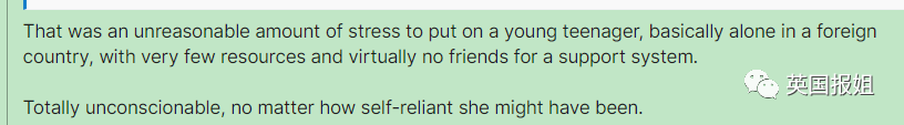 “给一个孩子身上加上了那么多难以承受毫无道理的负担,让她只身一人在外国,没有朋友和支援,不给她留下足够的生活物资。