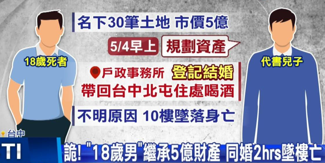 3. 儿子在结婚登记2小时后就从10楼坠落身亡。她根本不相信儿子会轻生,因为没有任何理由与动机。孩子首先刚继承了5亿多新台币的资产,又马上要迈入大学校园,开启光明的未来,怎么半天时间不到就先结婚后自杀了呢?