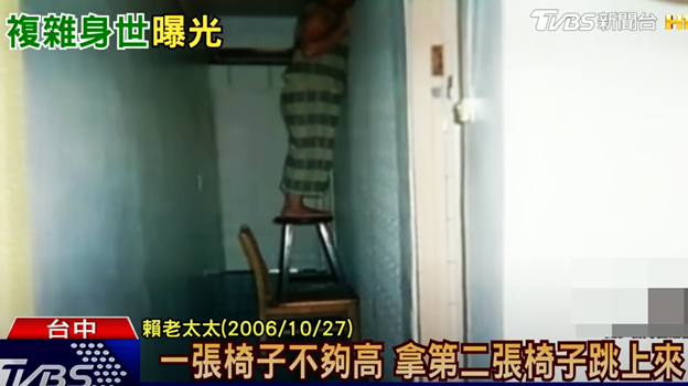 2006年,赖姓老者的老伴儿回家后发现房门紧锁,里面发出不可描述之声。她将两把椅子摞在一处登高望向屋内,看到了自己的老公竟在跟自己的儿媳妇做不可描述之事。