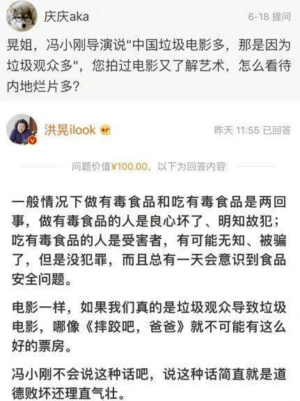 洪晃又怼回去:“做有毒视频和吃有毒食品的是两回事。”