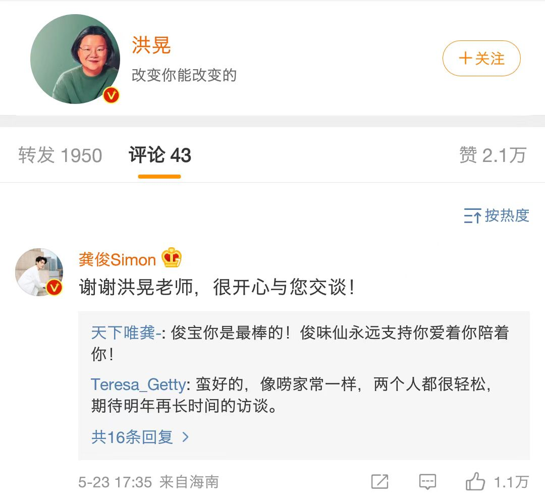 但也是关系好才这么说,在照片风波之后,洪晃和龚俊还在友好互动。