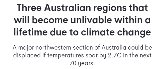 根据预测,到本世纪末,全球气温预计将上升2.7摄氏度。因为这个升温幅度,澳洲有三大地区将变得不再适合人类生存。
