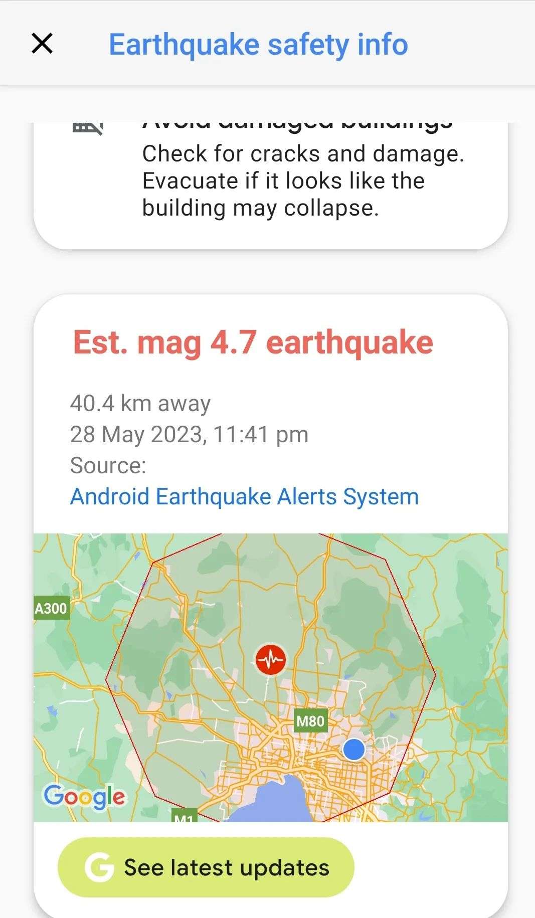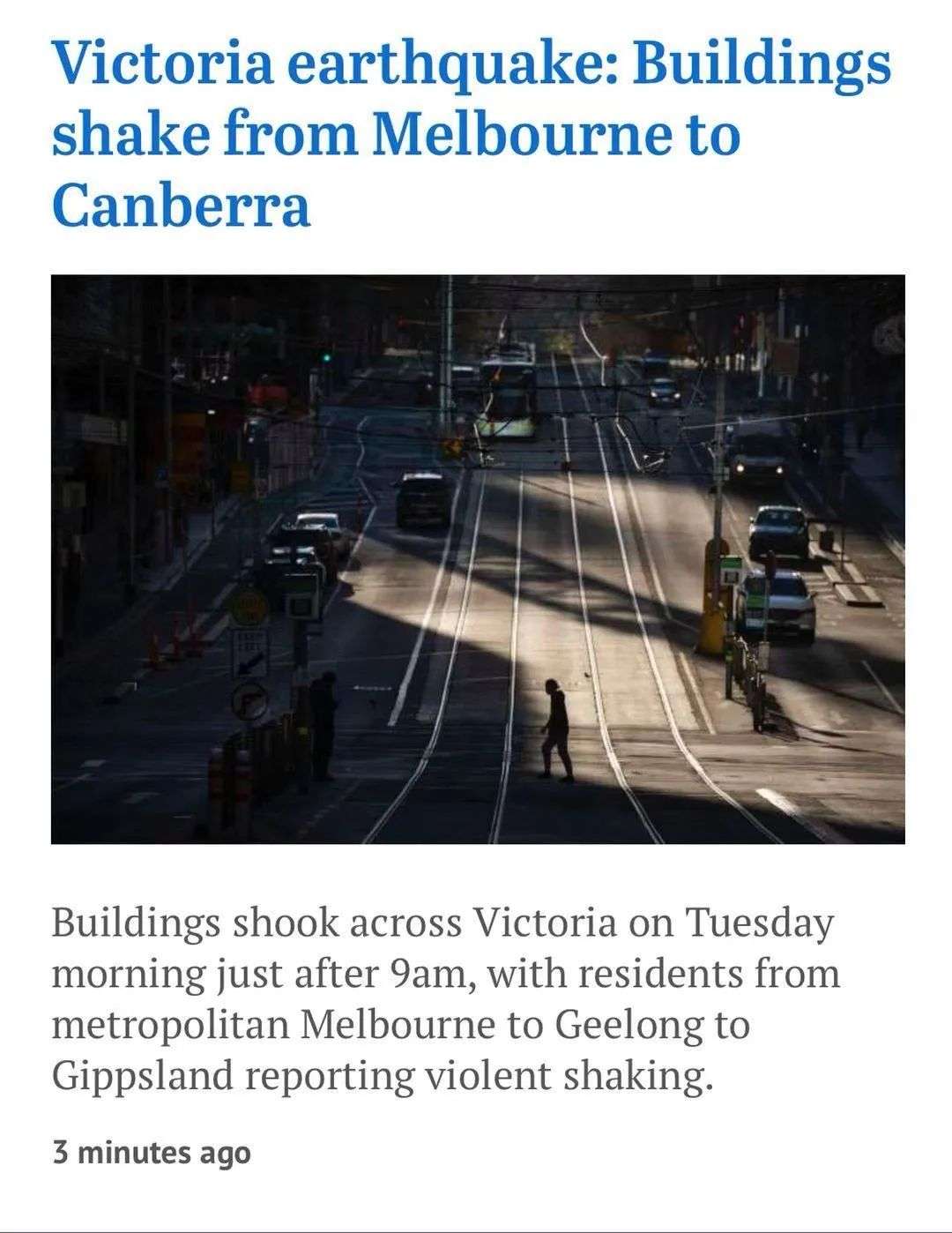 据悉,从墨尔本都市区到维州Geelong、Gippsland,甚至远到新州及首都堪培拉地区都有明显震感,当地建筑物出现剧烈晃动。