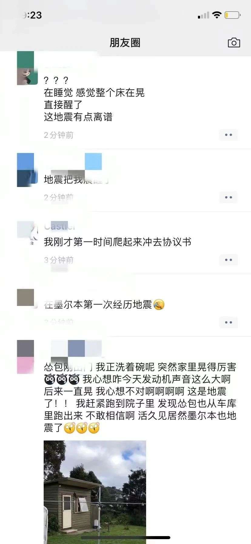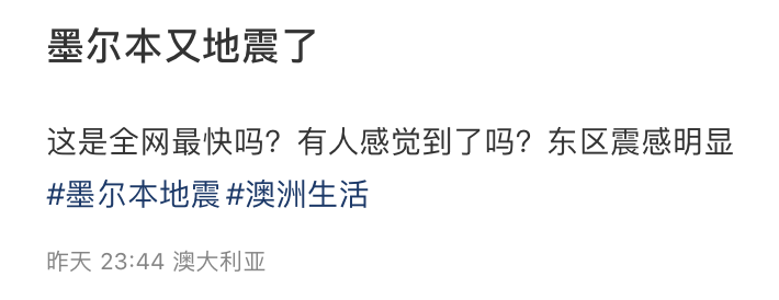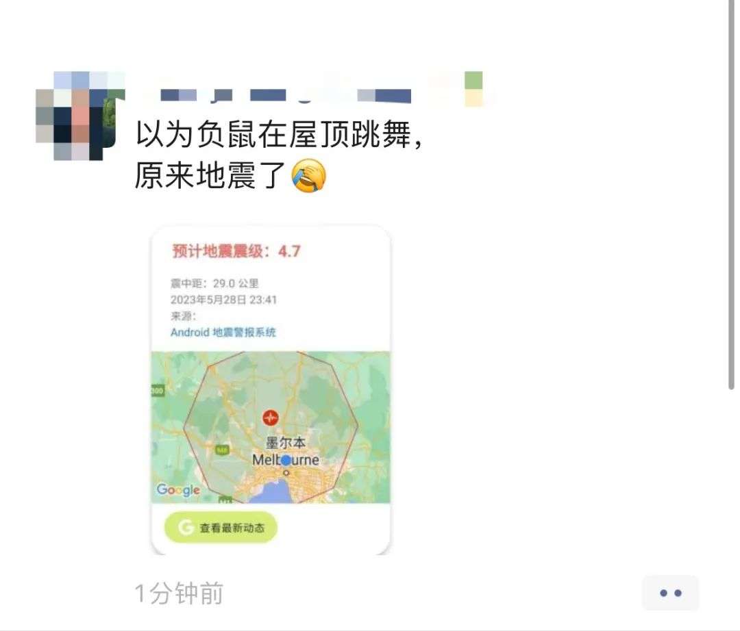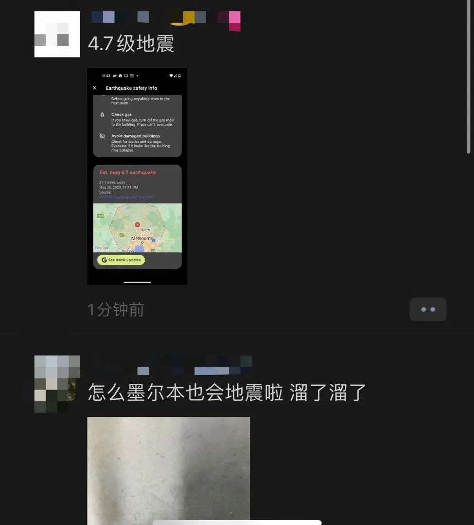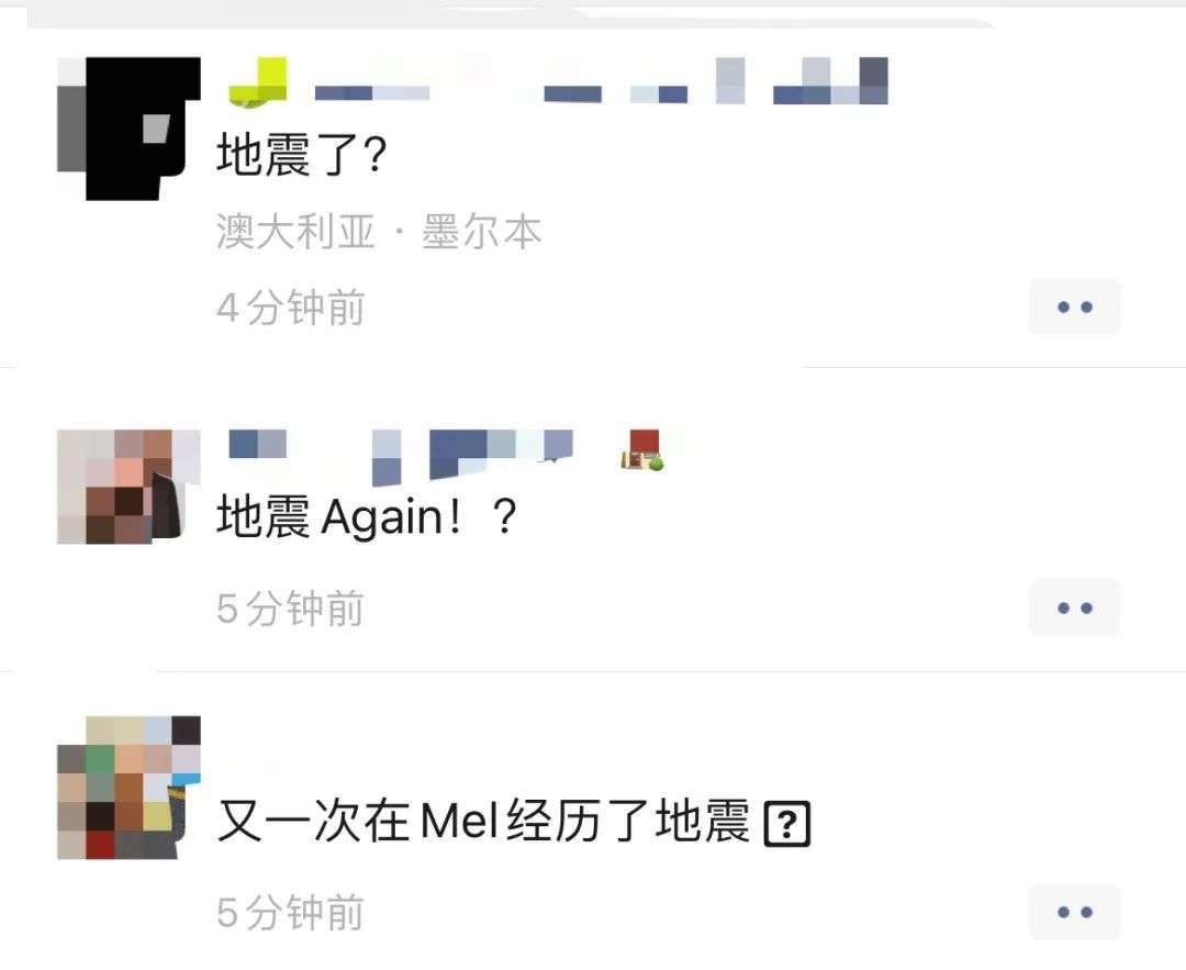 同时也有很多家住墨尔本的华人反映震感明显,有墨尔本CBD华人的朋友圈被刷屏,还有居民表示自己“生生被吓醒”: