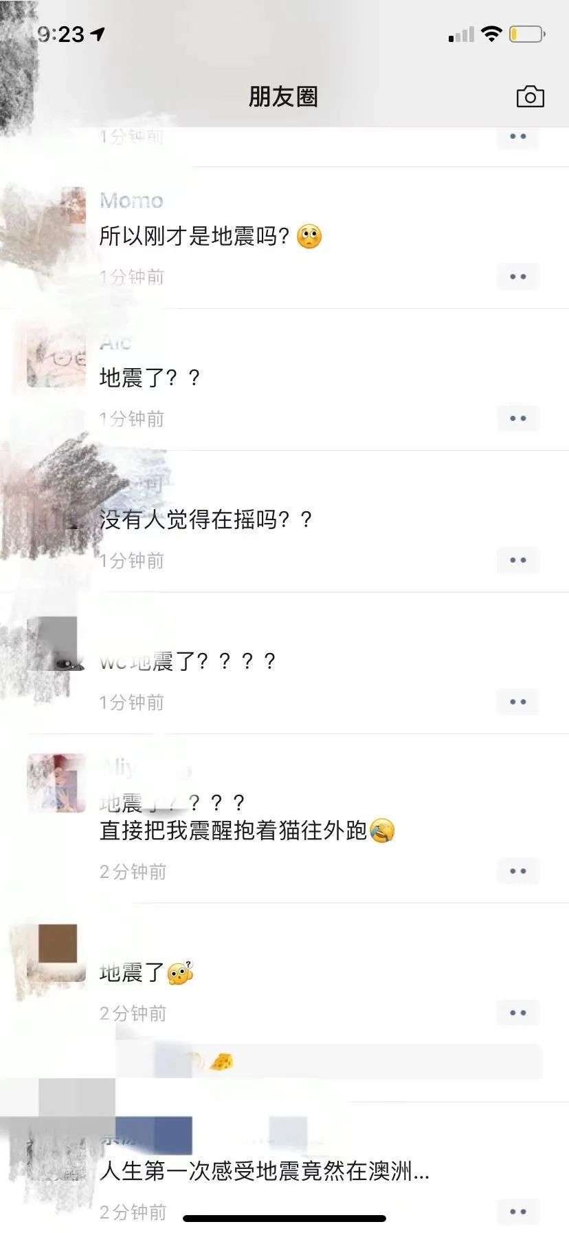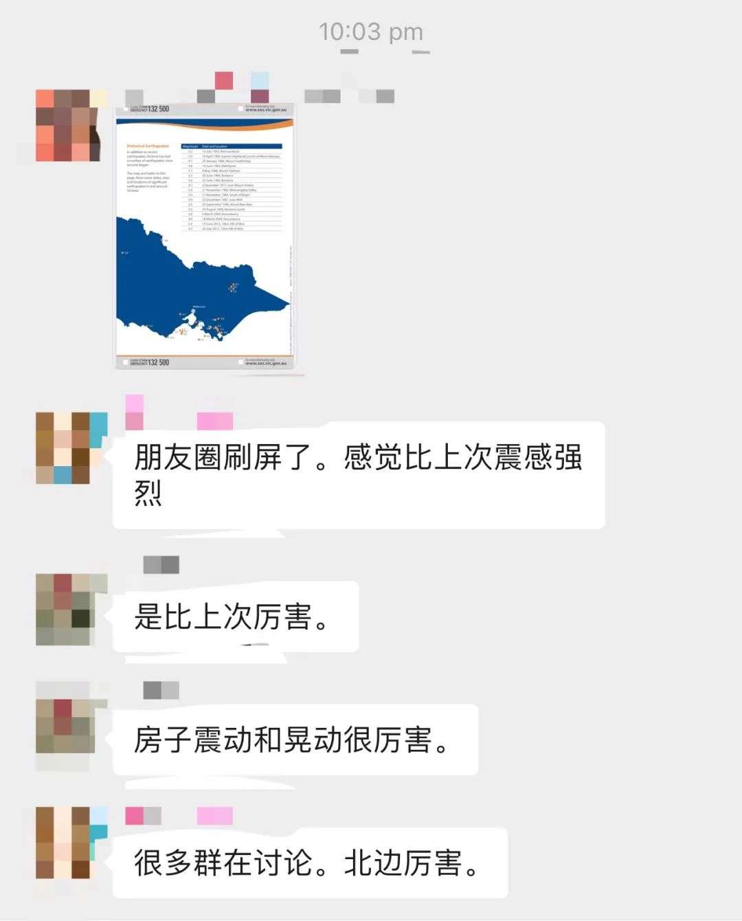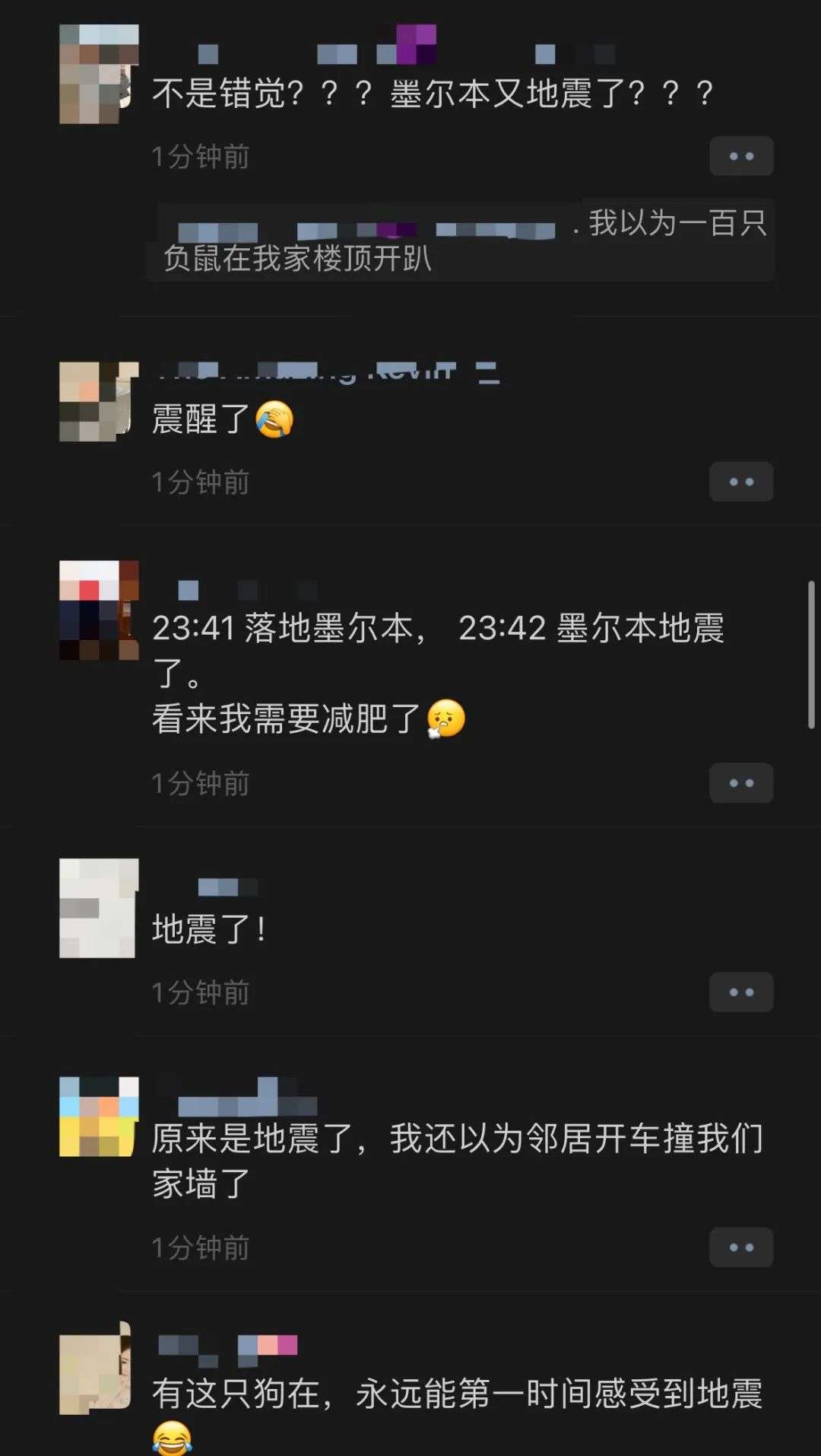 同时也有很多家住墨尔本的华人反映震感明显,有墨尔本CBD华人的朋友圈被刷屏,还有居民表示自己“生生被吓醒”: