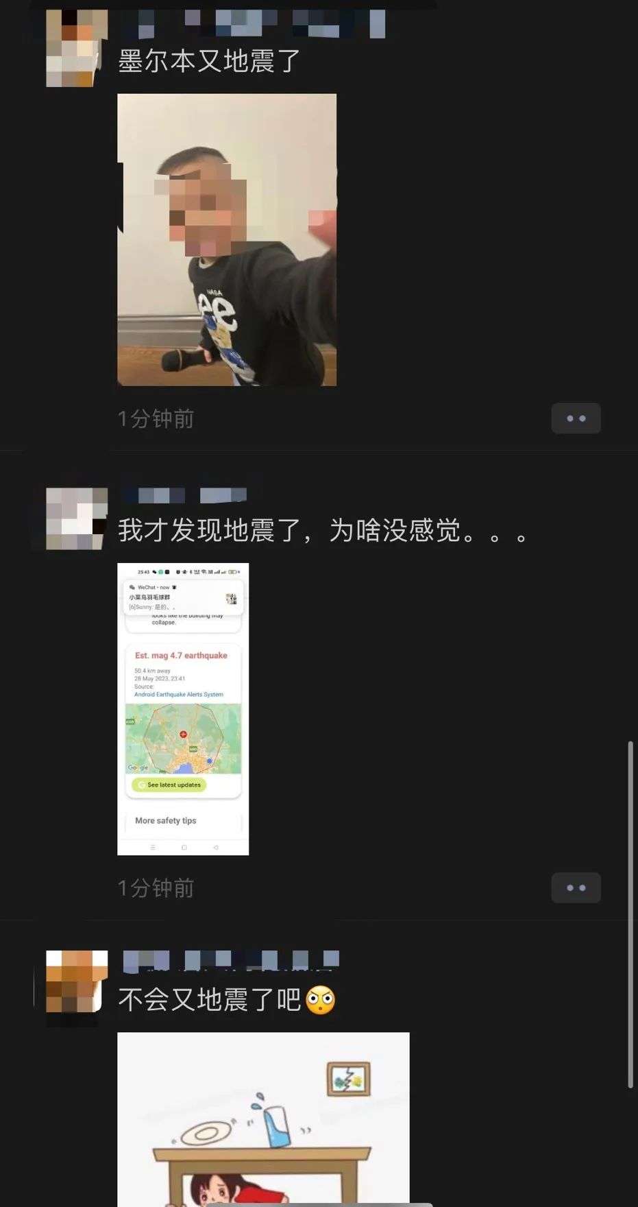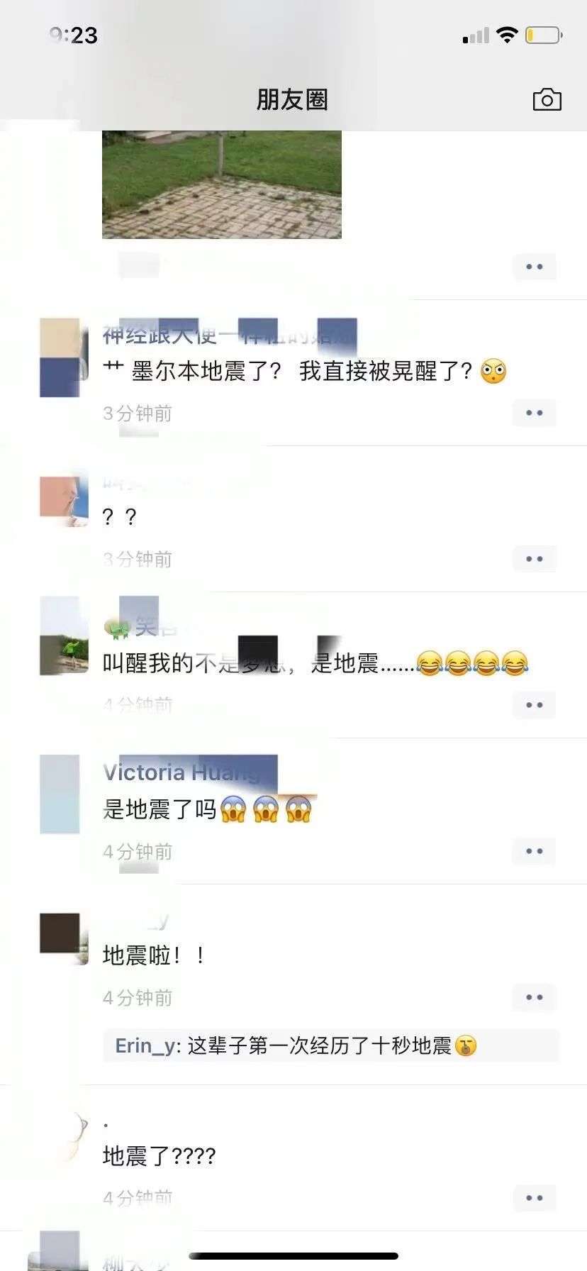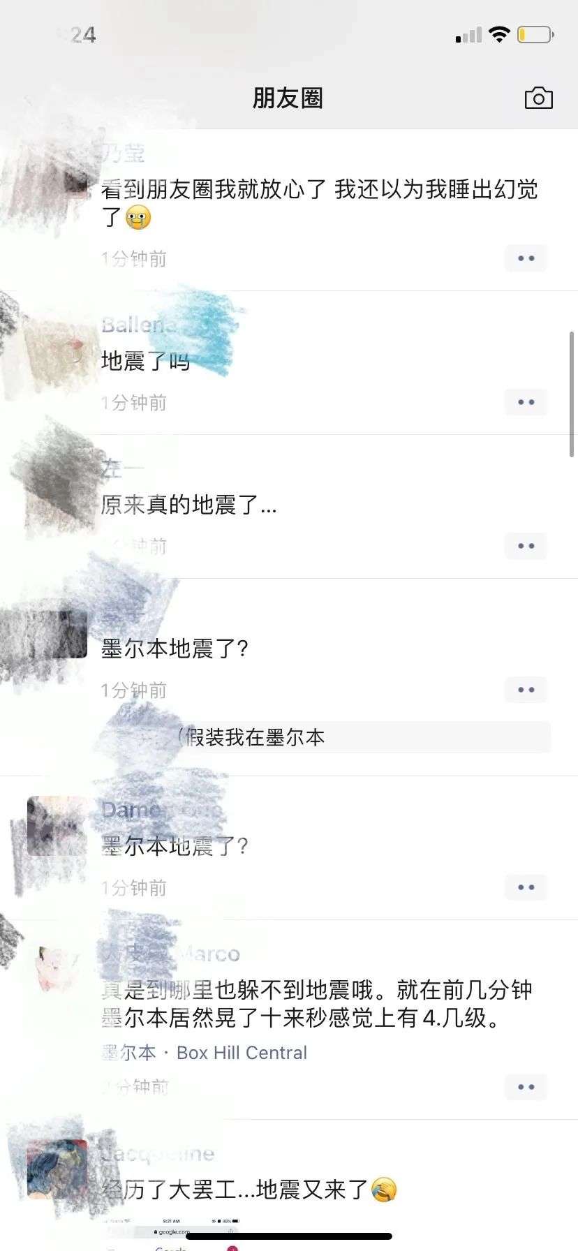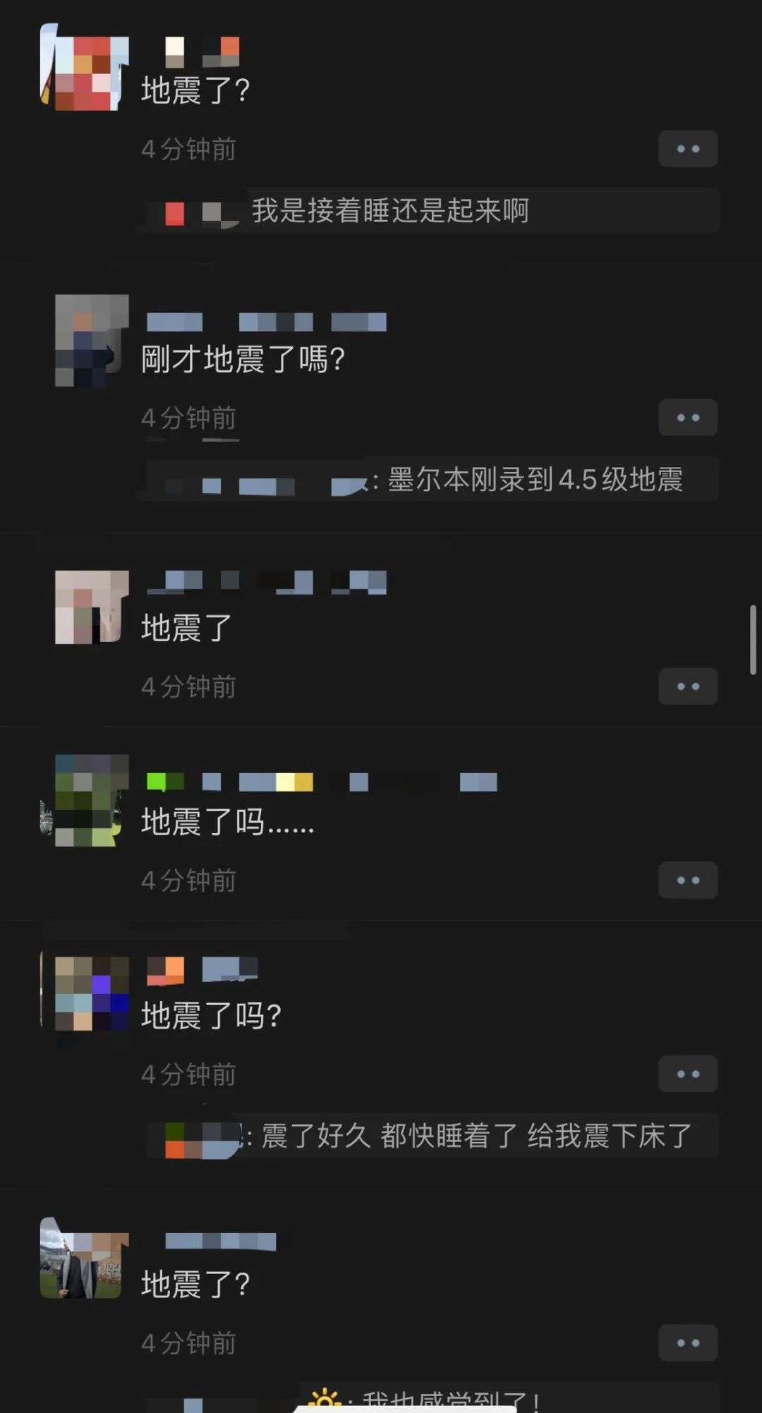 同时也有很多家住墨尔本的华人反映震感明显,有墨尔本CBD华人的朋友圈被刷屏,还有居民表示自己“生生被吓醒”: