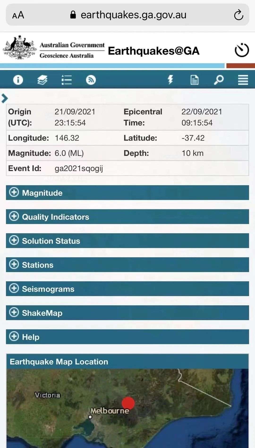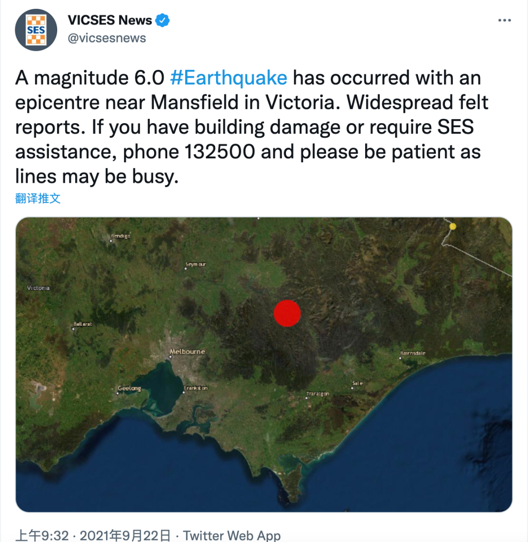 据维州紧急急救服务官方推特报,就在当天早上,维州Marsfield附近的震中发生了 6.0 级地震。救援服务中心收到了大量震感报告。