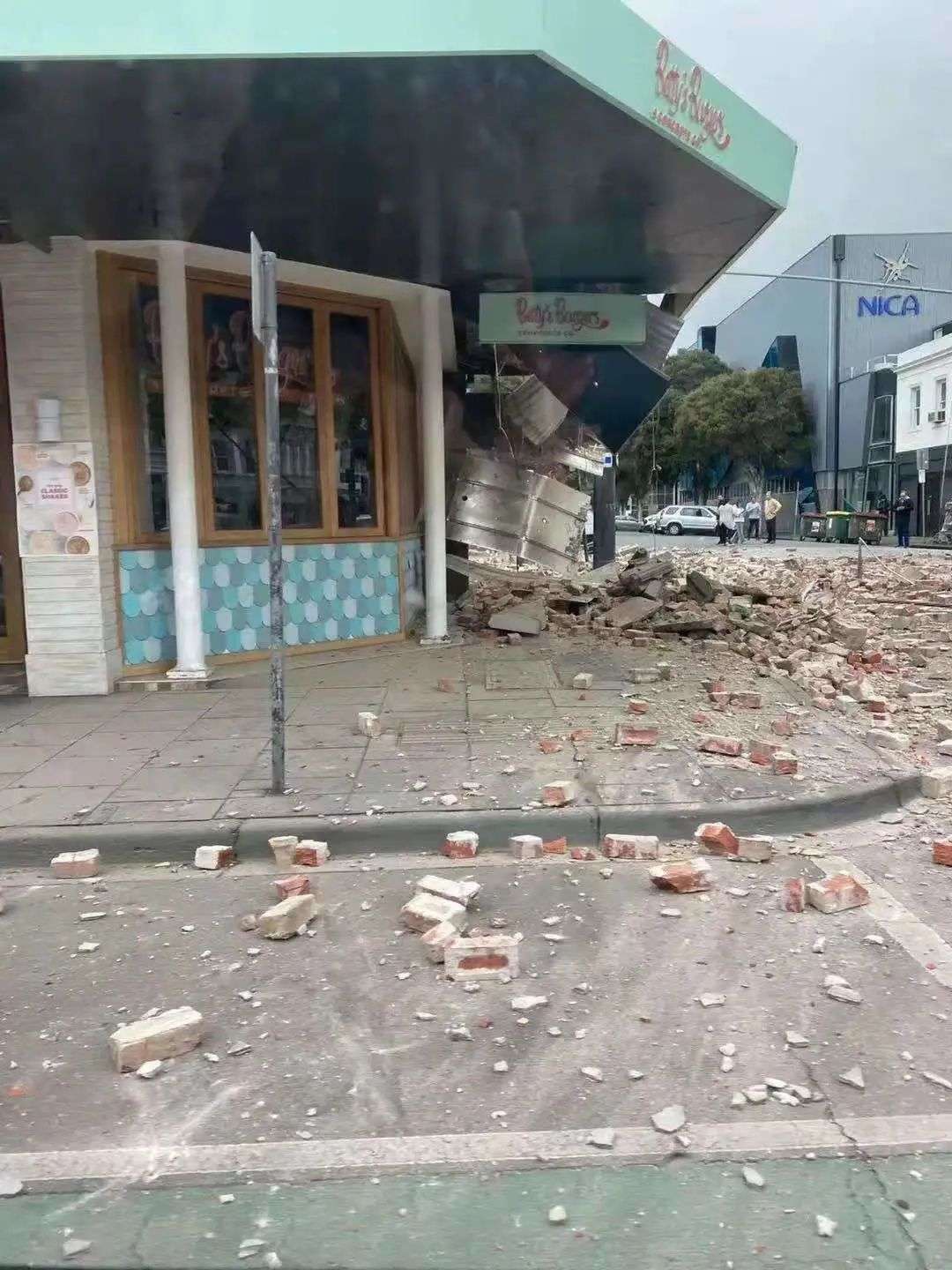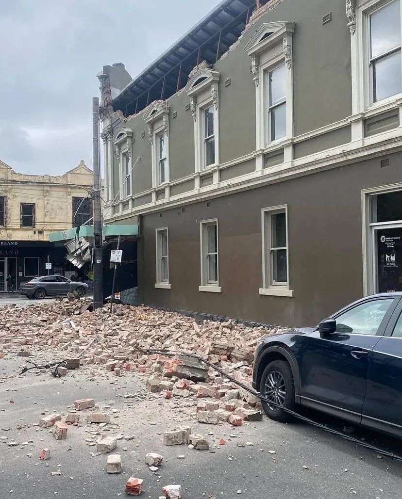 有家住墨尔本市区的推特网友发布视频,位于Chapel Street上的一栋建筑似乎因刚才的地震出现了明显的损毁,楼顶部分墙面坍塌在地面一片狼藉: