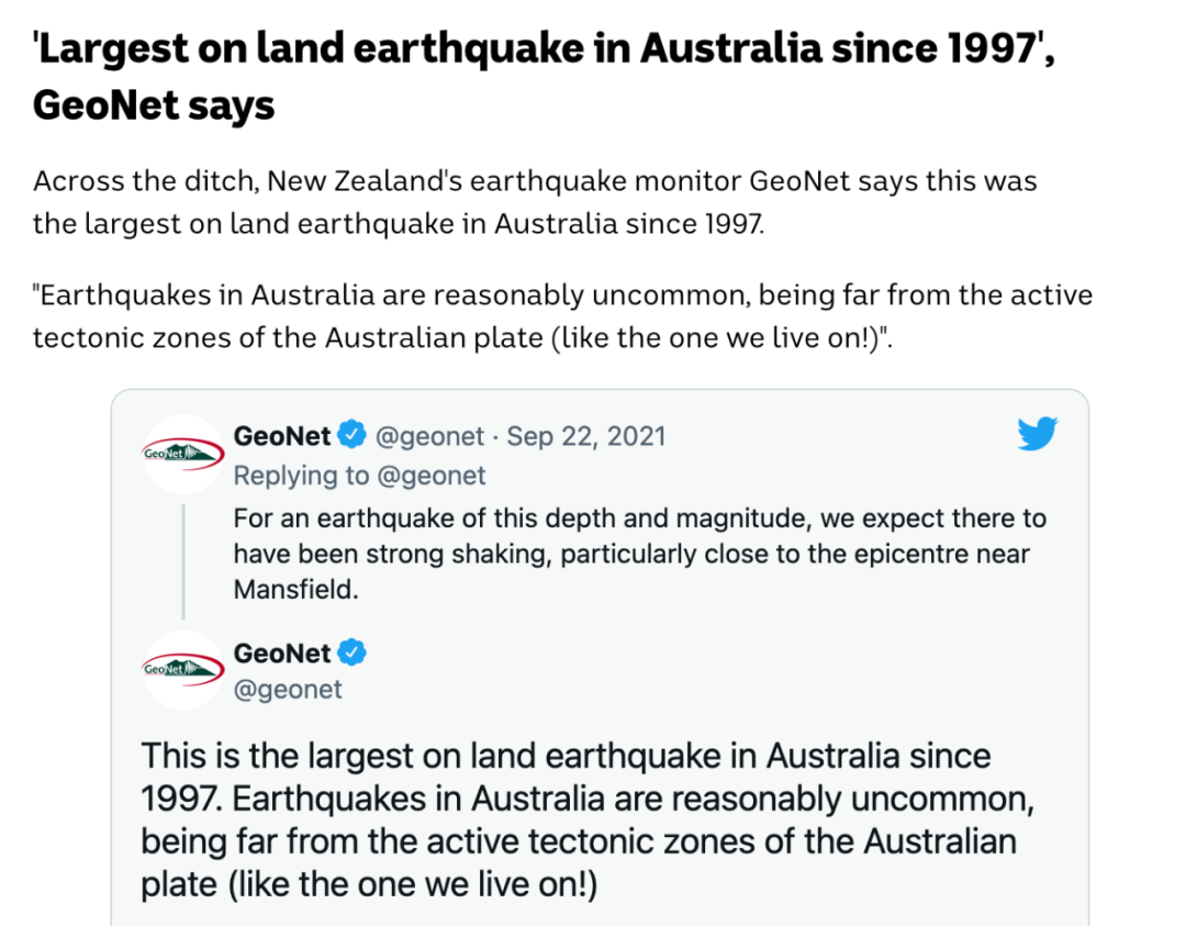 “澳大利亚的地震相当罕见,因为澳洲其实距离板块的活跃构造带很远(不像新西兰的那个板块)”。