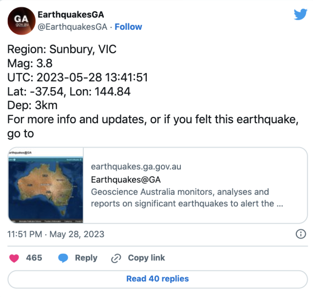 这个推特网友打趣提问:墨尔本此次地震会不会对房价有什么影响