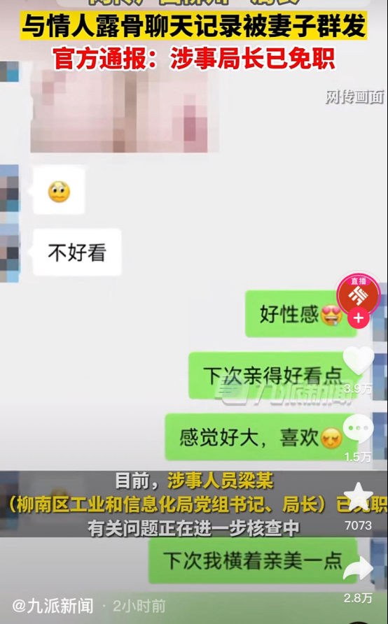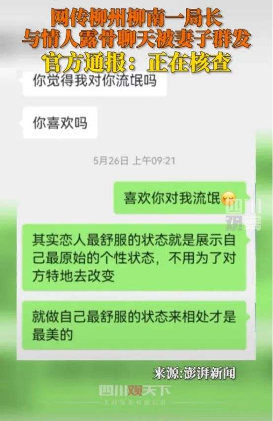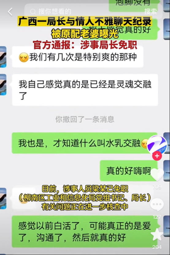 柳州官员在聊天记录中说,感觉自己出轨之后才真正体会到什么叫“水乳交融”,多次说自己和对方的匹配和舒服。