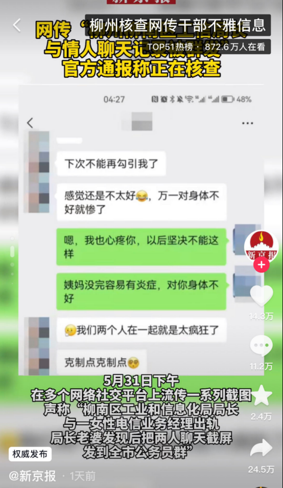 河南官员的不雅聊天记录事件才发生不到三个月,柳州的官员又爆出这样的丑闻。