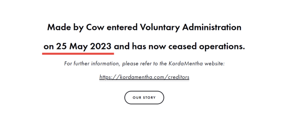 “ 我们怀着沉重的心情通知大家,从昨天开始,Made By Cow将关闭,并由KordaMentha任命,进入自愿管理阶段。我们为这段不可思议的旅程感到自豪,我们创造了一款真正创新的产品,得到了成千上万忠实客户的喜爱。近年来,我们的业务发展势头强劲,同比增长超过50%。但是在这种不确定的环境下,利率和通货膨胀不断上升,企业面临着经济的不确定性和供应链的挑战,因此,我们做出了非常艰难的停产决定。”