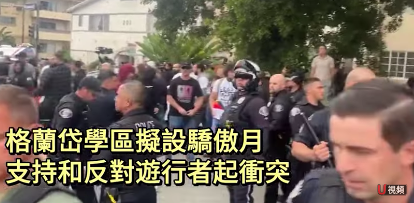 6月6日早上,数百名抗议者聚集在格兰岱联合学区办公楼外,大多为学生家长,部分人高举彩虹旗,另一部分人高举美国国旗。其中,抗议学区通过LGBTQ(性少数群体)相关政策的人高呼“别管我们的孩子”。