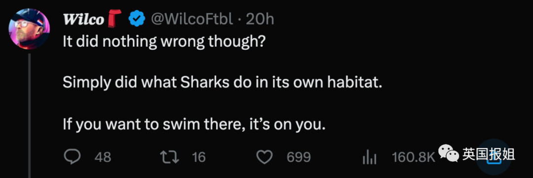 “鲨鱼做错了什么吗?它只是在自己的栖息地正常生活而已,如果你恰好在人家附近游泳,那你就得接受后果。”