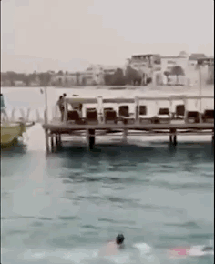 下一个镜头,他被鲨鱼倒着拖入水中,两腿伸出水面挣扎,水花不断被掀起。这时大部分岸边的游客都看出来发生了意外,岸上的游客喊着“鲨鱼,快点游啊!”可是这已经太晚了。