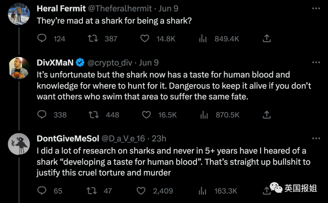 ——“我这五年多做了很多关于鲨鱼的研究,我从来没有听说鲨鱼吃完人之后,就会喜欢上吃人。别为了合理化这些人残忍的虐待和杀戮行为编瞎话!”