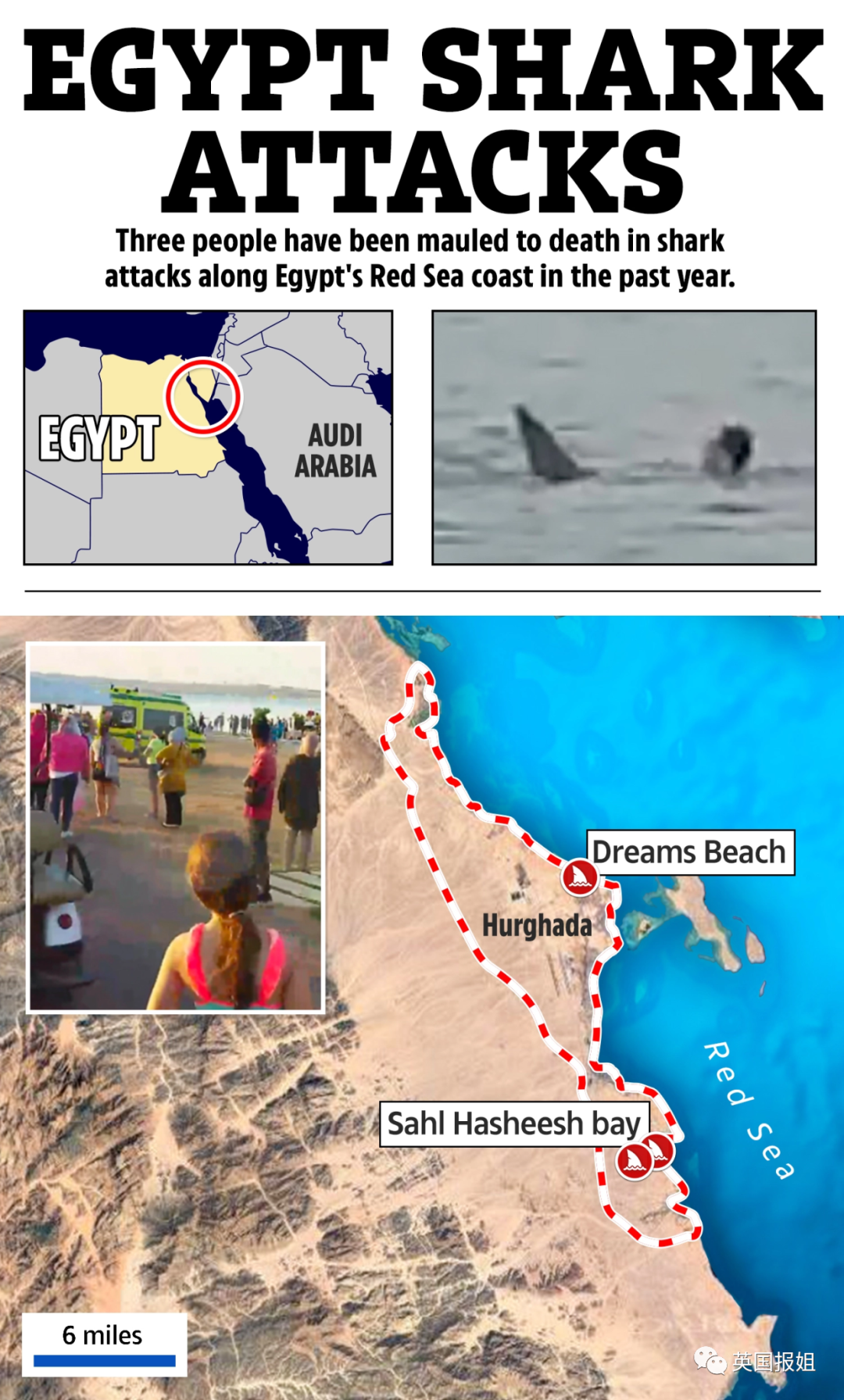 6月9日,埃及度假胜地赫尔格达的海滩上,发生了一幕堪比电影《大白鲨》的惨案。一名年仅23岁的俄罗斯男子在海中游泳时遭到鲨鱼的猛烈袭击。