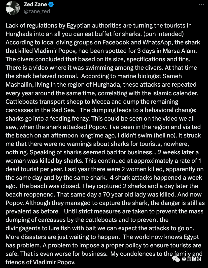 埃及当局缺乏相应的法律法规,让赫尔格达的游客一次次变成鲨鱼自助餐。据脸书和WhatsApp上的当地潜水团体称,咬死弗拉基米尔的鲨鱼3天前在那片区域被发现了。这是潜水员们根据它的大小、规格和鳍得出的结论。有段视频显示这只鲨鱼在潜水员附近游泳,看起来很正常。