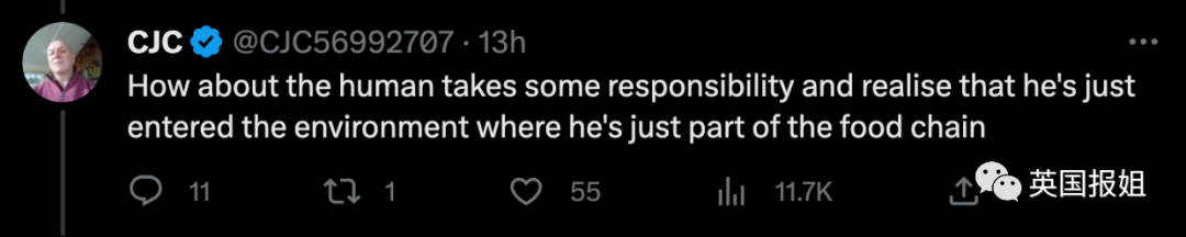 “为什么不让人类吸取吸取教训,让他们意识到当他们进入大自然的时候,就是可能会成为食物链的一环的呢。”
