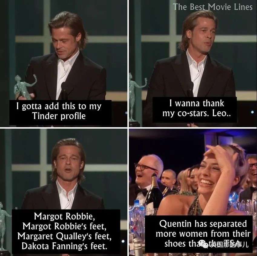 2020年布拉德皮特因《好莱坞往事》拿到美国演员工会奖(SAG),发表获奖感言的时候就打趣道: