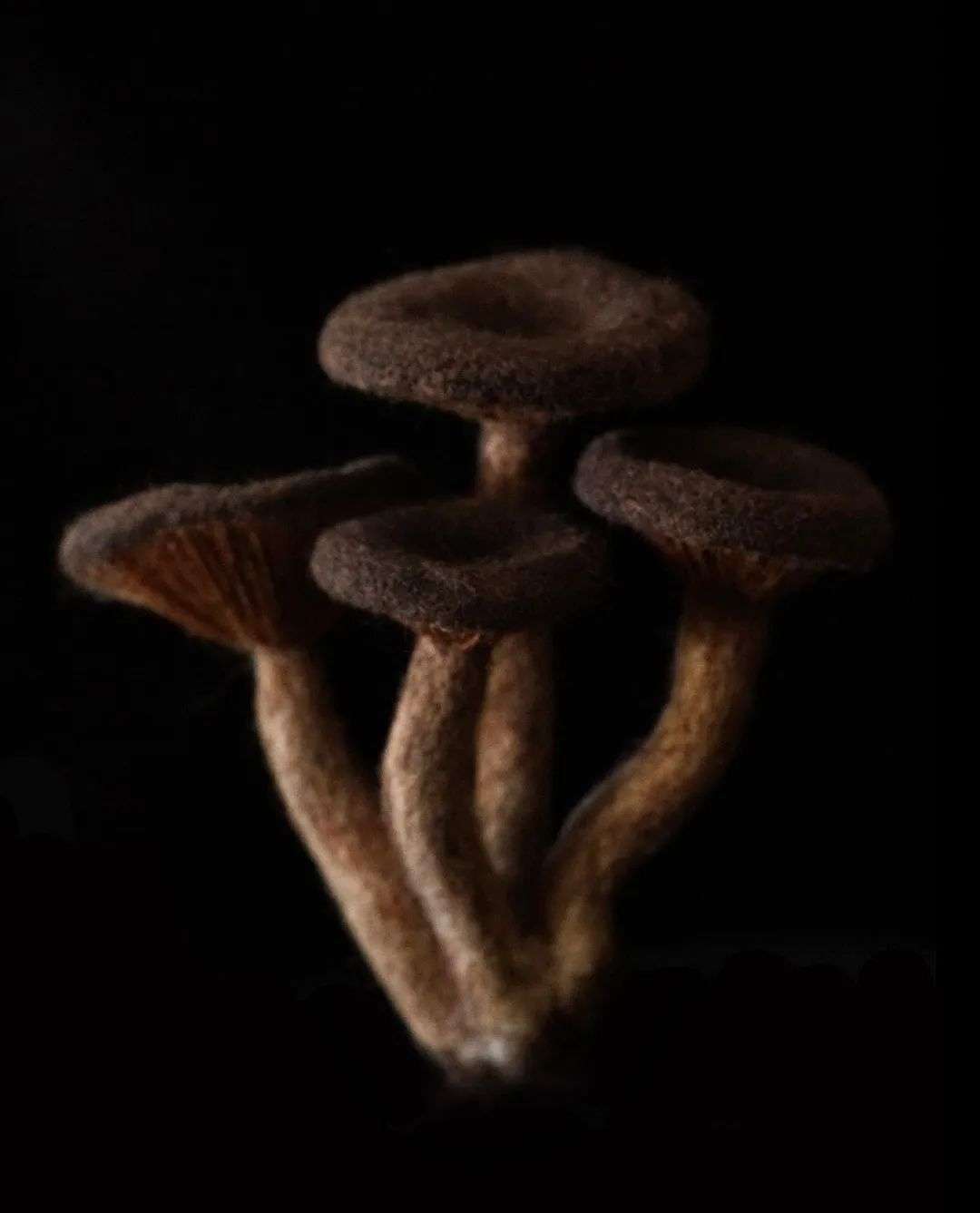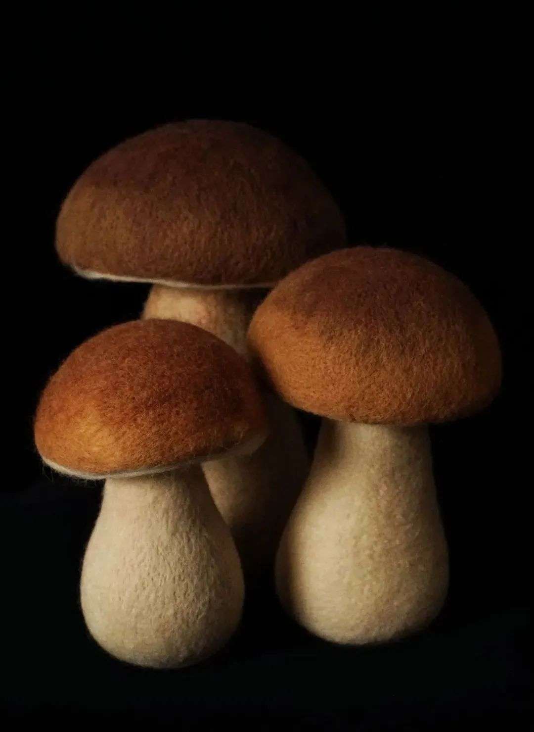 起初的想法很简单,就想制作一些看起来非常真实的蘑菇摆放在家里。用羊毛和其它纤维材质尽量去表现蘑菇的生命感,按1:1的比例,还原出真实的蘑菇,也算是对技术的一种挑战。
