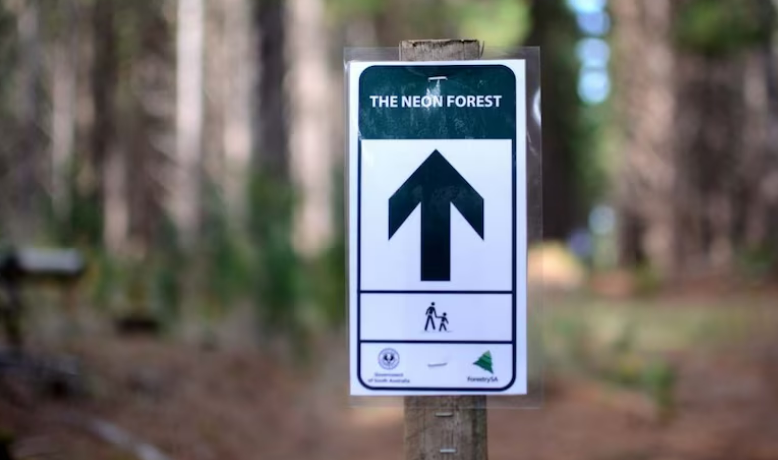 松树种植园中的一个标志向觅食者展示了在哪里可以找到幽灵蘑菇。(提供:Forestry SA)