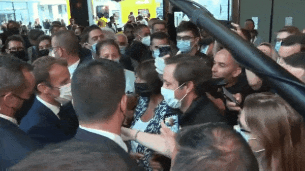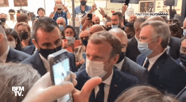 2021年9月27日,马克龙总统在里昂举办的国际餐饮旅馆及食品沙龙(SIRHA)考察时,突然被从人群中飞出来的一颗(没剥壳的煮)鸡蛋砸中肩膀。