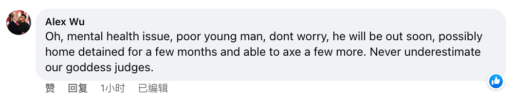 “大概率是心理健康出了问题。可怜的年轻人,别担心,他可能很快就会被放出来了,在家里拘留几个月,然后再出来砍掉几个。”
