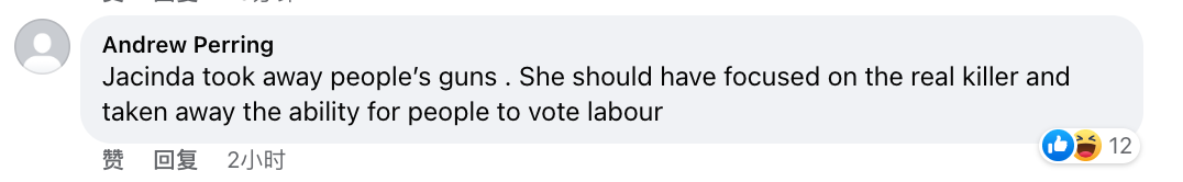 “Jacinda拿走了人们的枪(指基督城枪袭后,前任总理颁发的限枪法令),但并没有真正终结暴力,她应该把注意力放在真正的杀手身上。”