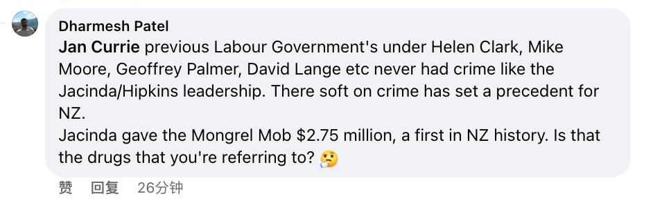 “以前的工党政府,在Helen Clark、Mike Moore等历任领导下,从没有这么高的犯罪率;Jacinda和Hipkins领导的软弱政府,为新西兰树立了一个向犯罪低头的先例。”