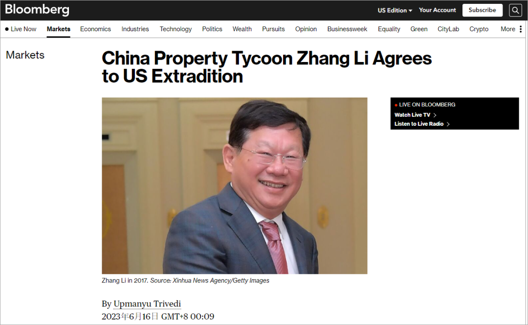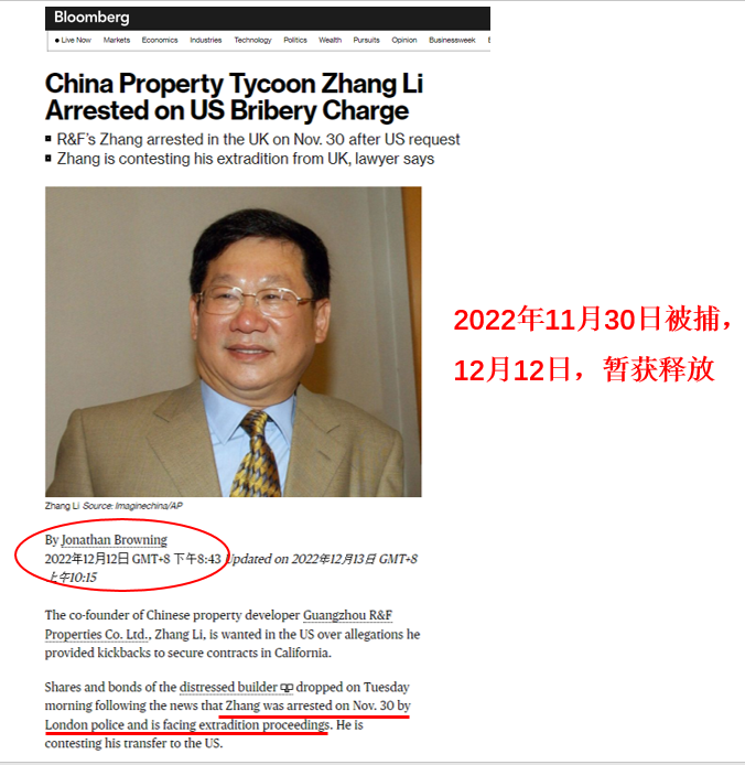 ▲图:富力地产张力因美国贿赂指控被捕(彭博社)