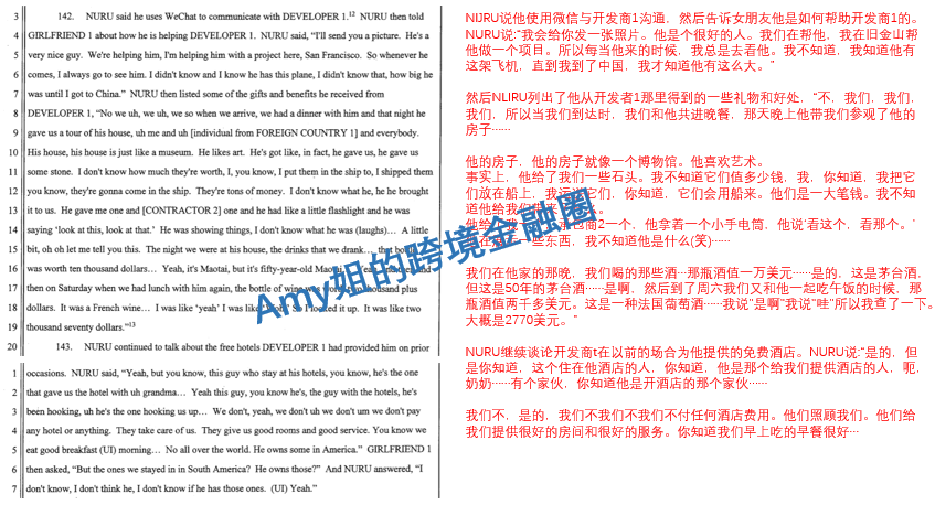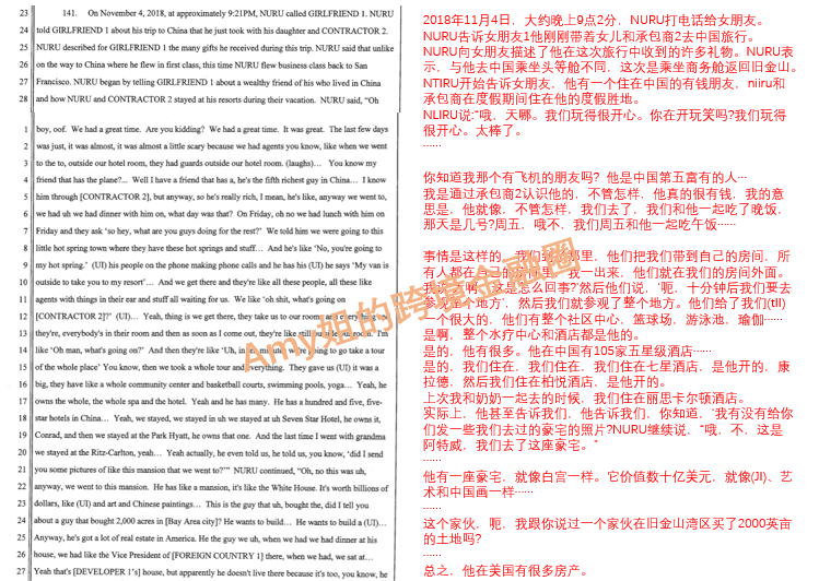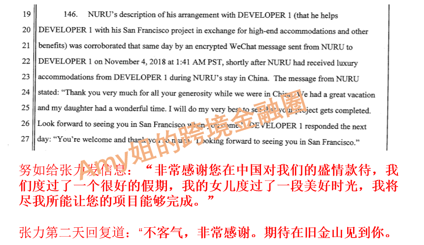 ▲图:起诉书中关于努如向女友眉飞色舞谈中国行的部分。(里面开发商1是张力,承包商2是黄永乐)