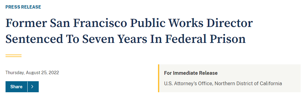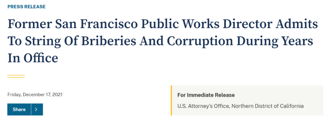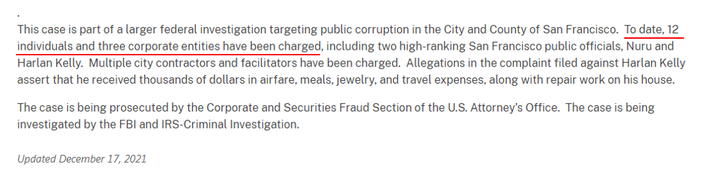 继续发酵,作为针对旧金山市和县公共腐败的更大规模联邦调查的一部分,截至2021年12月17日,已有12名个人和3家公司实体受到美国联邦指控,