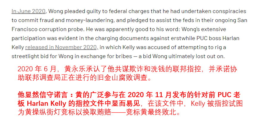而在另一边在旧金山市对黄永乐的调查中,黄永乐在2021年5月与市府和解,和解协议条款包括黄永乐返还旧金山170万美元(这笔款项包括他从与市府合同中挣到的钱,以及认罚的罚金),以及包括禁止黄永乐和与他有关联的任何公司,取得市府合同的资格,以及在5年内,黄永乐不得再从事许可代办。黄永乐还答应,在公权力腐败案调查方面,与市律师长办公室继续保持合作。
