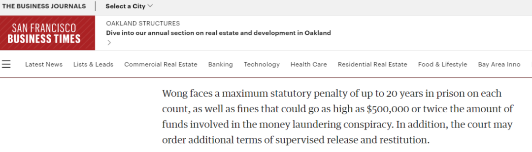 根据旧金山商业时报的说法,黄永乐面临每项罪名最高20年监禁的法定处罚,以及最高50万美元的罚款,或者洗钱所涉金额的两倍。此外,法院还可以下令额外的监督释放和赔偿条款。