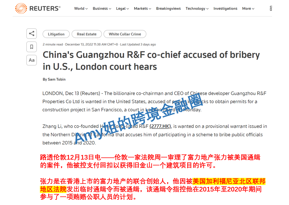 消息称,富力联合创始人张力,已经同意从伦敦被引渡到美国,以面临为在加利福尼亚州获得合同而行贿的刑事指控。