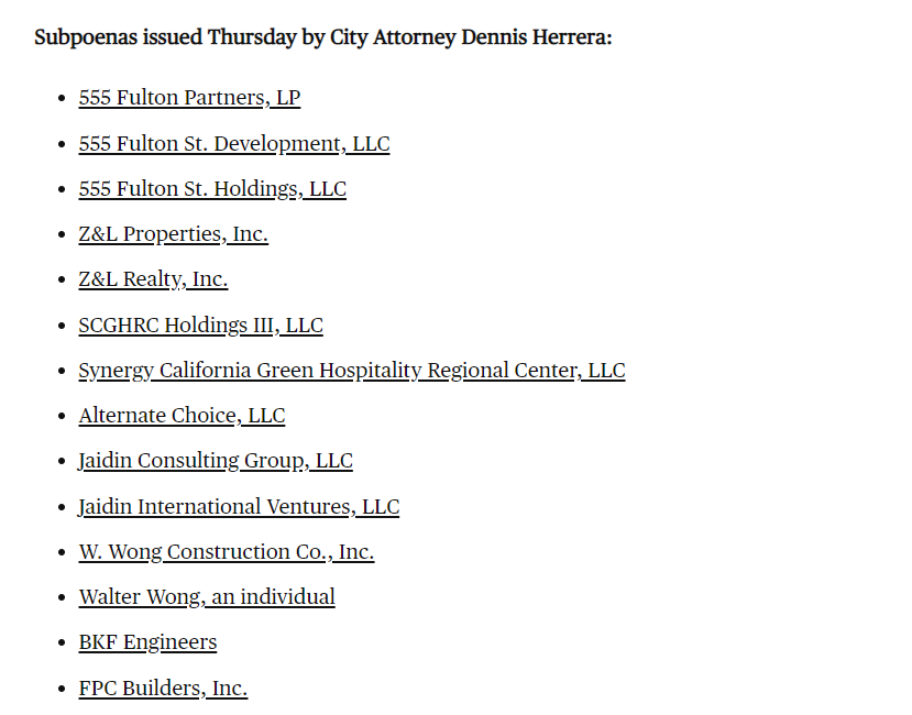 要求他们提供张力试图贿赂旧金山官员、市府部门雇员的相关文件,还要求被传召者交出与555 Fulton项目有关的通信来往、财务纪录,以及批准文档等等。